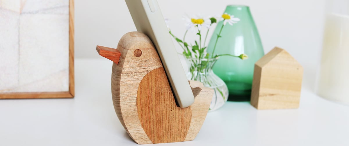 【埋め木】の技術で鳥を表現した木製スマホスタンド 楠を羽の形に彫って欅を埋め込んだ、 埋め木加工を施した鳥さんのスマホスタンドです。 おいしい飲み物を入れたら、 スマホを鳥さんに預けてホッと一息しませんか。 置物としてもそのまま飾っていただけます。 クラフトボックスにお入れして お届けしますのでギフトにもオススメです。 ◾️お支払い確認後から20日前後で発送いたします。 ◾️サイズ:W96×D40×H90mm
